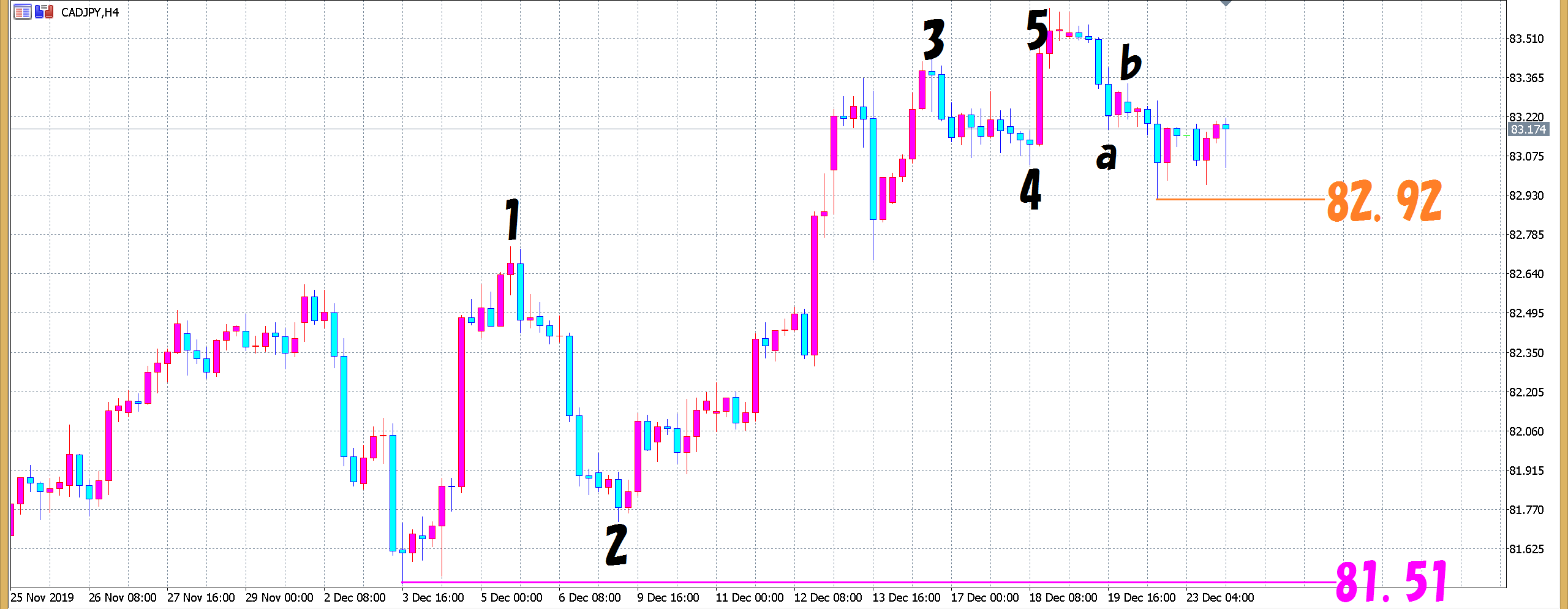 4時間足のエリオット波動は現在、アップトレンドのエリオット波動のc波だと思ってます。